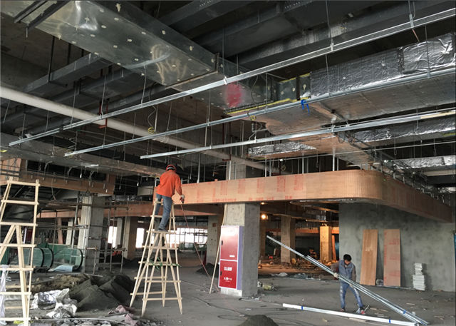 1、時(shí)尚百貨:一、二層公共區域吊頂正在安裝吊頂龍骨、做吊頂造型,三、四、五層公共區域吊頂封板完畢。二層商鋪內正在粘貼地磚,安裝頂面龍骨、做吊頂造型。